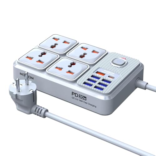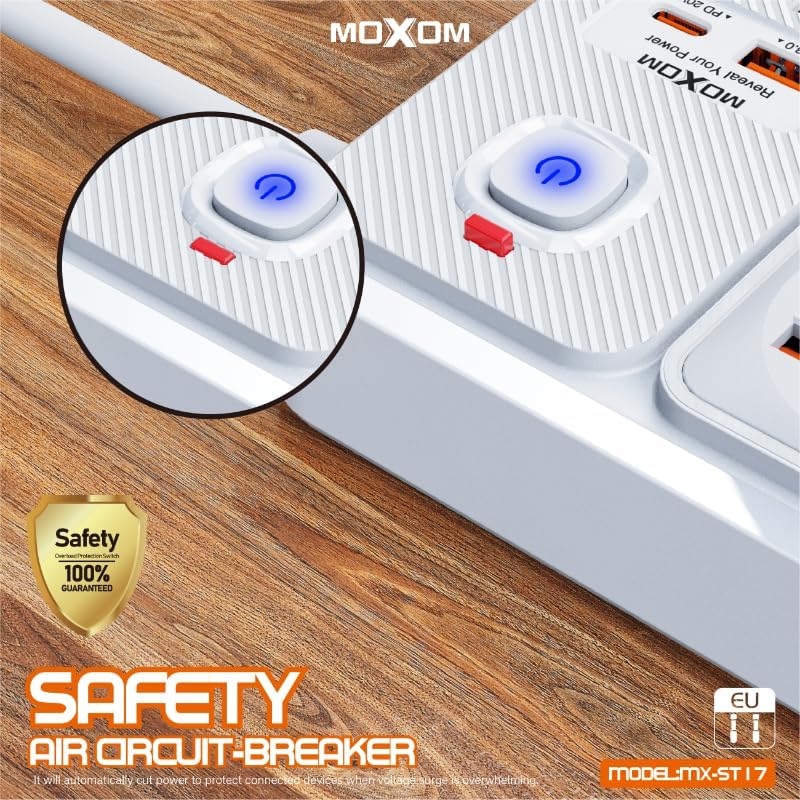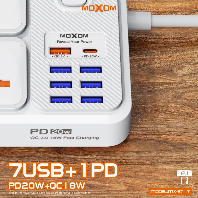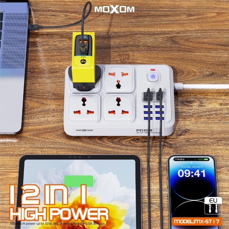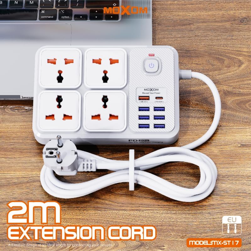 MOXOM - مشترك توصيل طاقة بتصميم 12 في 1 من موكسوم، مزود بعدد 4 مقابس و7 منافذ USB و1 منفذ نوع سي ومفتاح تحكم رئيسي واحد، مناسب للعديد من الأجهزة بقوة 2500 وات، متوفر بطول 2 متر ولون أبيض، موديل MX-ST17