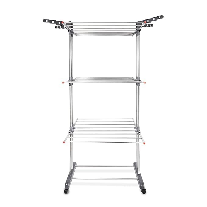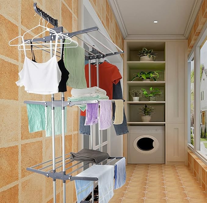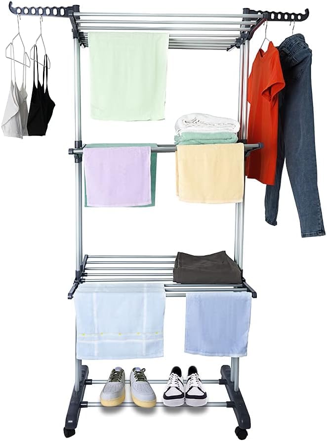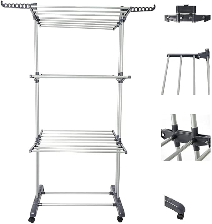 - تصميم قوي ومتین: إطار معدني متين متعدد المستويات يوفر مساحة واسعة لتعليق الملابس والفوط ومستلزمات غسيل الملابس الأخرى.