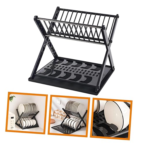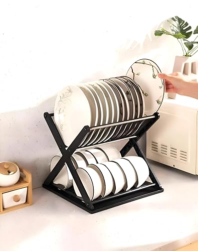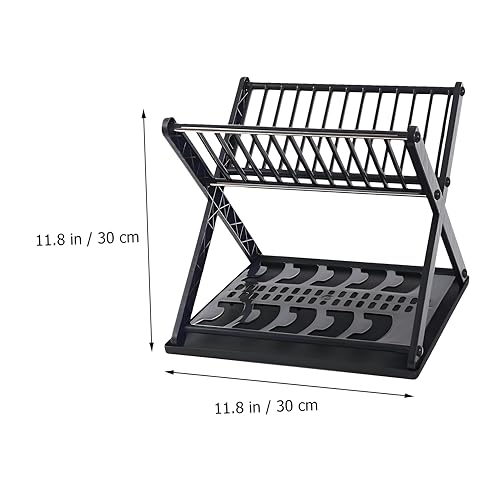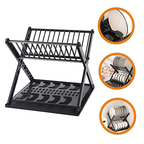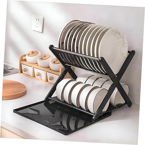 Generic - مصفاة أطباق متعددة المستويات ومنظم يتميز بدرج على شكل حرف X مقاوم للتسرب ورف مضغوط لتجفيف الأطباق بشكل انسيابي في المطبخ اسود