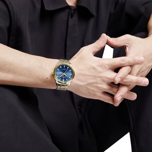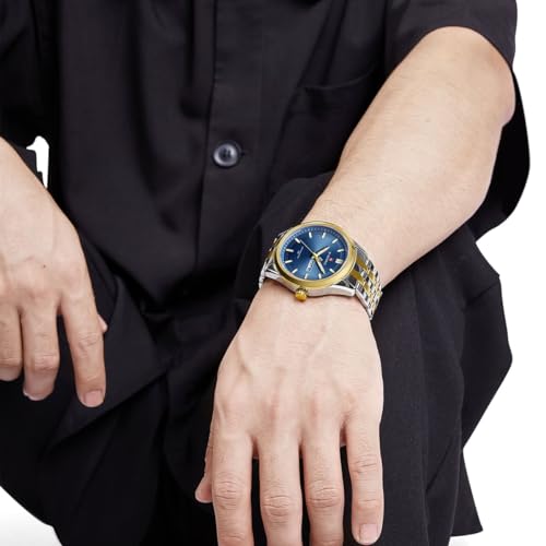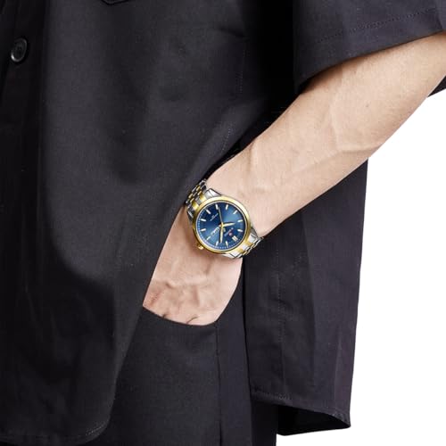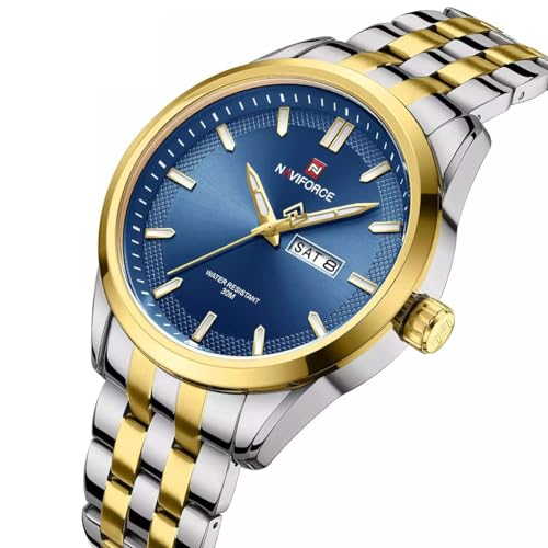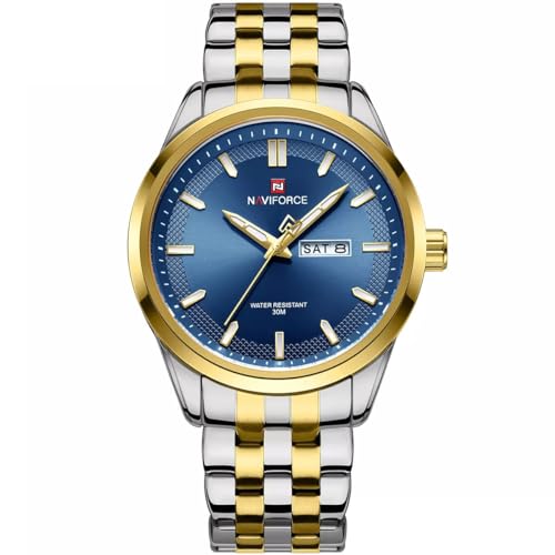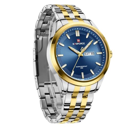 Naviforce - ساعة يد نافي فورس NF9203-G-BE للرجال لدريم NF9203 مع مينا أزرق وسوار معدني بلون فضي وذهبي، رقمي تناظري