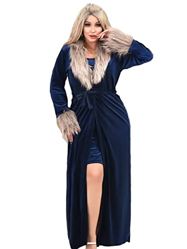 Generic - قميص نوم و روب كحلى قطيفة مزين بفرو