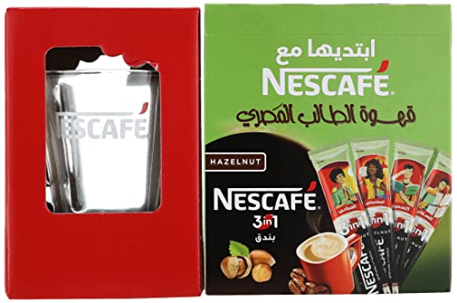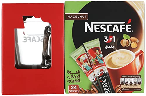 Nescafe - عبوة اكياس نسكافيه 3 في 1 بالبندق من ، من 24 كيس بوزن 18 جرام مع مج زجاج مجاني