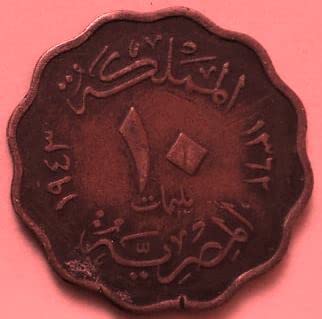- عملة معدنية قديمة فئة 10 مليمات إصدار 1943 مع صورة فاروق الأول ملك مصر
