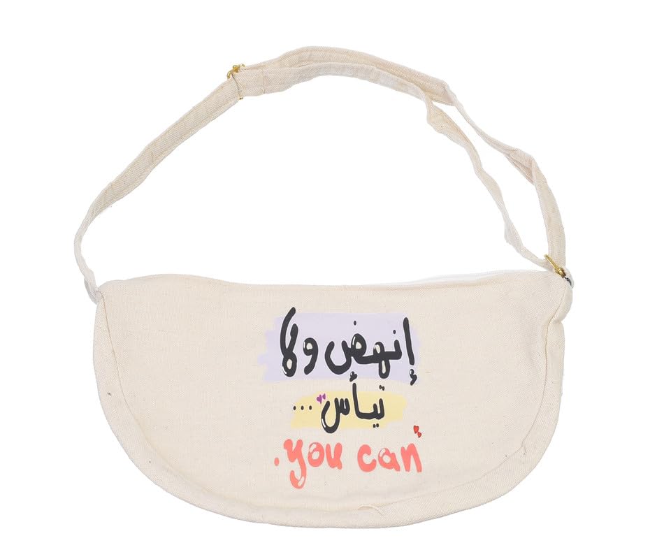 OX - شنطة خصر حريمي من القماش بتصميم عصري مطبوع عليها عبارات مرحة مع سوستة من او اكس، لون اوف وايت، مقاس W-27