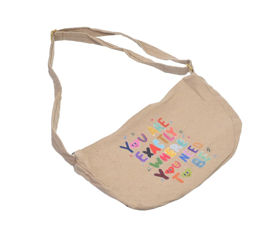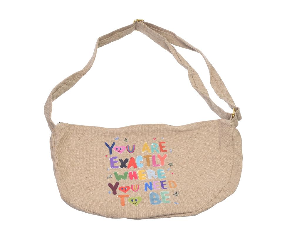 OX - شنطة خصر من او اكس للنساء من القماش بتصميم عصري مطبوع عليها عبارات هزلية بسوستة، لون بيج W-76
