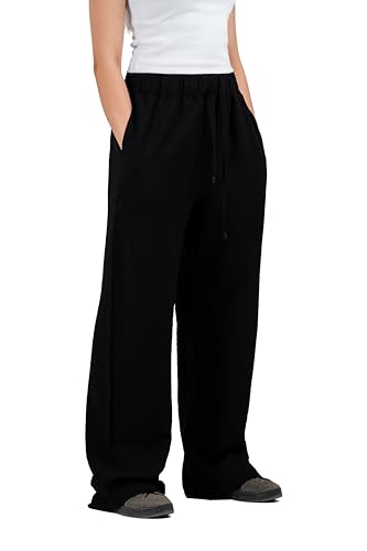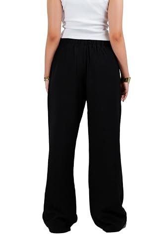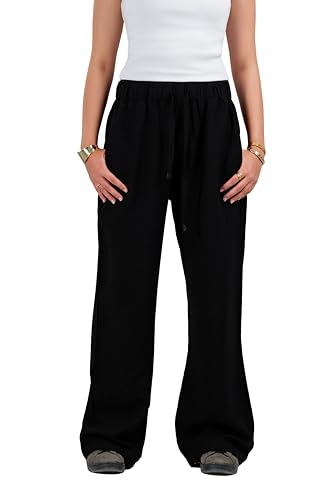 Generic - بنطلون كتان للنساء من بلين دي في - بنطلون خفيف الوزن بارجل واسعة برباط وجيوب | اسود وازرق فاتح | بنطلون صيفي جيد التهوية للسفر والارتداء اليومي (مقاس S-3XL)