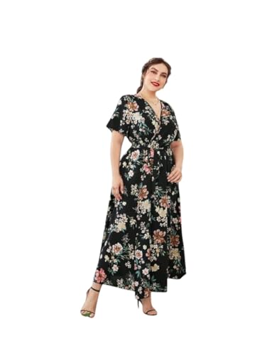 Generic - فستان نسائي طويل بلس سايز بطبعة ورود ورباط خصر – تصميم صيفي أنيق