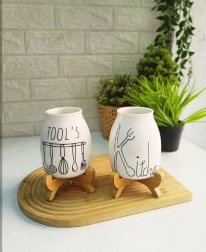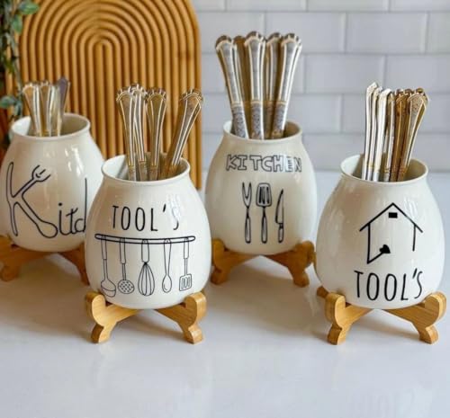 Generic - حامل ملاعق بتصميم أنيق، باللون الأبيض، مصنوع من الخزف والخيزران، متعدد الاستخدامات، مثالي لديكور المطبخ