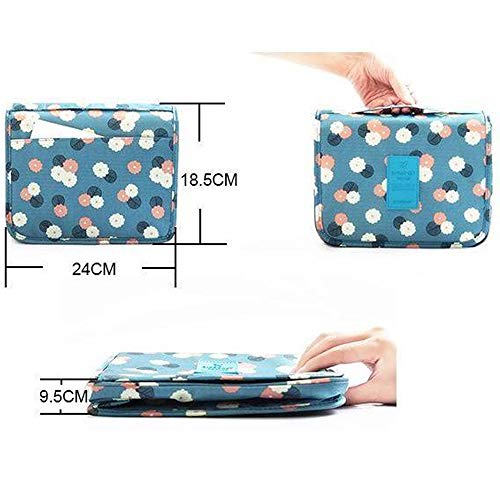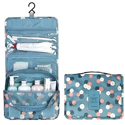 Spaceshoop - شنطة أدوات التجميل مقاومة للماء ومحمولة للسفر مزودة بخطاف للتعليق مثالية لتخزين مستلزمات الحمام ومستحضرات التجميل بشكل منظم وسهل أثناء التنقل، بتصميم زهور زرقاء