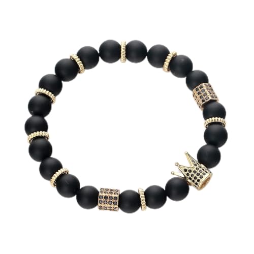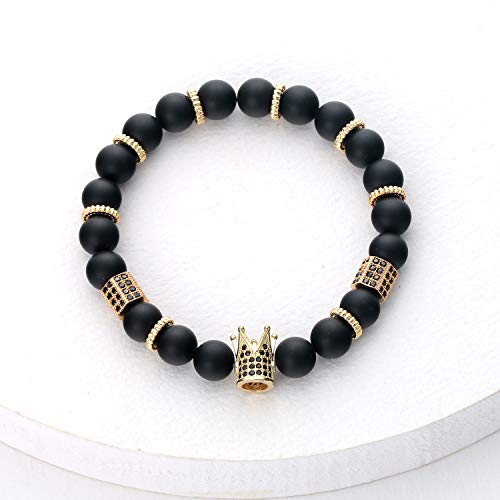 POSHFEEL - سوار قابل للتمدد من الاحجار الكريمة الطبيعية مقاس 8 ملم، سوار مزين بالزركونيا المكعب بتصميم تاج ملكي، مجوهرات هدايا للرجال مصنوعة يدويا, 7.5 inches, حجر