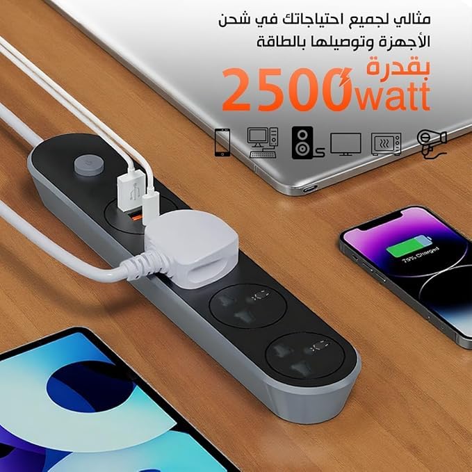 - موزع طاقة الكل في واحد للمساحات المزدحمة - قم بتشغيل الموبايلات والمراوح وأجهزة اللاب توب والمصابيح في وقت واحد. مع 3 منافذ تيار متردد ومنفذي USB، فإن مشترك الكهرباء هذا مثالي للمنازل المصرية المزدحمة والمكاتب المشتركة.