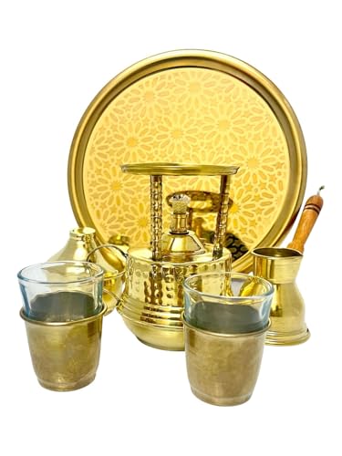 • **طقم متكامل:** يشمل كنكة، سبرتاية، وأكواب زجاجية مع حافظات نحاسية، وصينية تقديم مزخرفة لتكتمل تجربة تقديم القهوة الأصيلة.