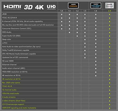 - الدعم: 4K، لون عميق، ثلاثي الأبعاد، xvYCC (لون xv)، مزامنة تلقائية للشفاه، ARC، CEC، HDCP، دولبي ترو HD، HEC - فيديو ثلاثي الأبعاد عبر وصلة HDMI - عمق اللون: 24 بت (16.7 مليون لون) - حماية ثلاثية عالية الجودة.