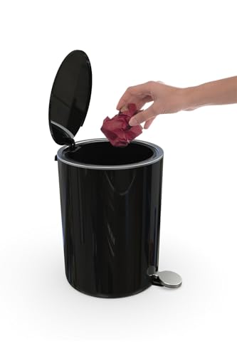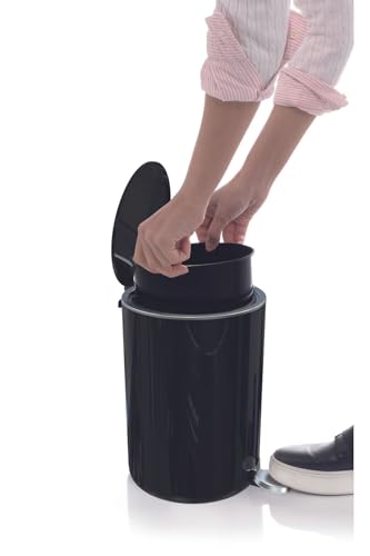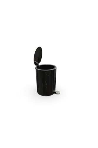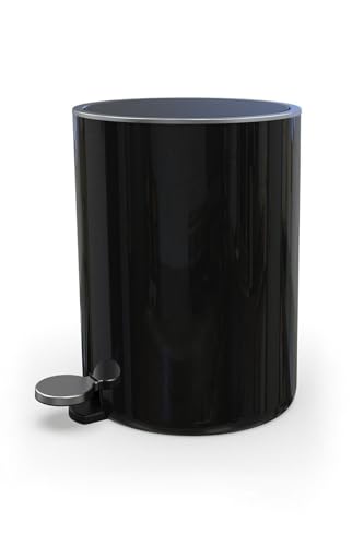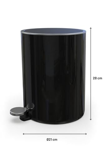 Primanova - سلة مهملات من الاكريليك بتصميم دائري الشكل مزود بغطاء اغلاق سلس مناسبة للحمام تاتي مع داخلية قابلة للازالة البلاستيك ناعم سعة 5 لتر سوداء بلاستيك ستانلس ستيل بريمانوفا الضغط بالقدم