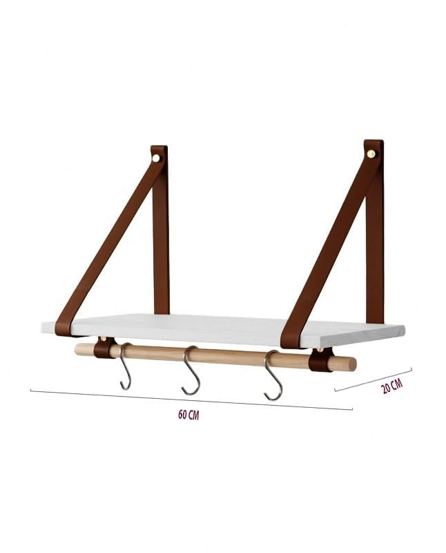 Home Gallery - رف يعلق على الحائط بحزام من الجلد الصناعي، 60×20 سم - أبيض، خشب مُصنع