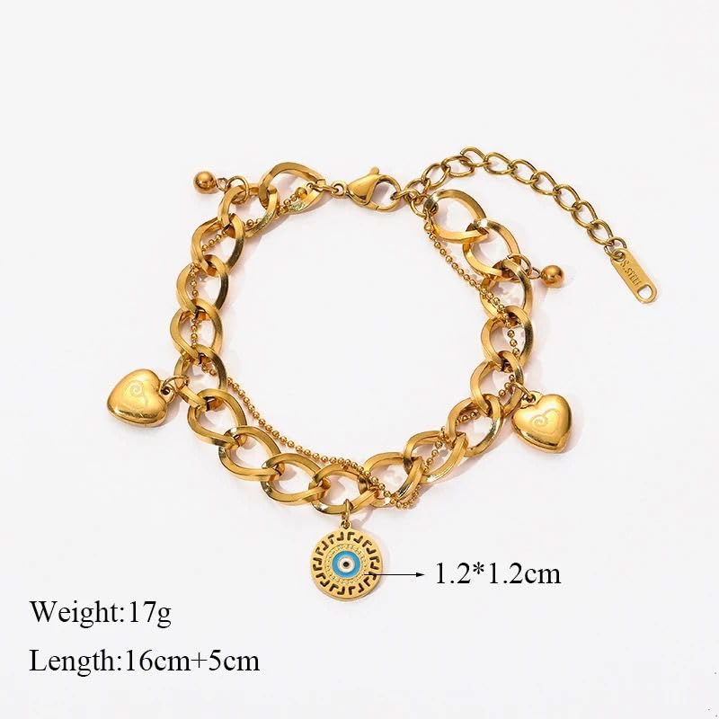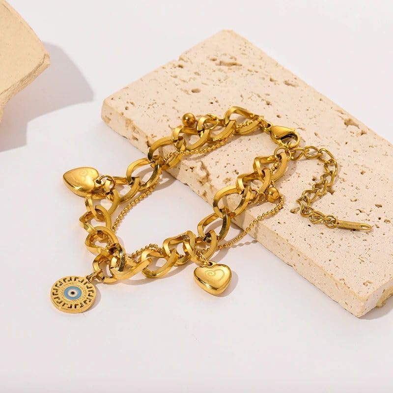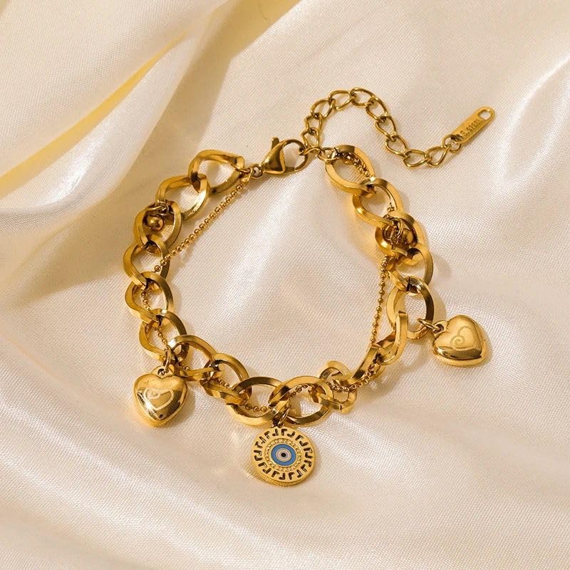 Qshop - اكتشف سحر مجوهرات اساورستانلس ستيل مطلية بالذهب عيار 18 قيراط للنساء شكل عين و قلوب سوار عصري قابل للتعديل والبنات من كيوشوب®️ لمعان يدوم جاذبية لا تضاهى