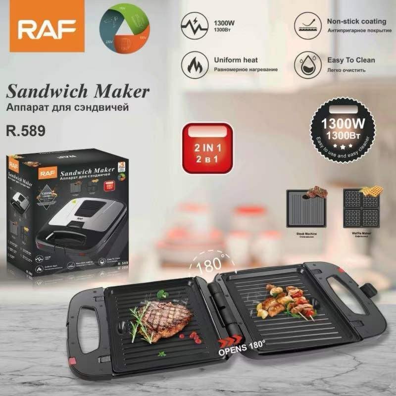 RAF - محضرة شطائر من راف موديل R.589، بتصميم عصري، مصنوعة من الباكلايت مع طلاء غير لاصق، باللون الأسود، قدرة 1300 واط، مع تحكم في درجة الحرارة ولمسة باردة