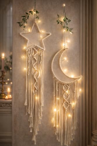 - تصميم رمضاني فريد بشكل هلال ونجمة. مصنوع يدويًا بدقة من خيوط المكرمية. خفيف الوزن وسهل التعليق. مناسب لتزيين الجدران والأبواب. خامات متينة وصديقة للبيئة. يضفي أجواء دافئة ومبهجة على المنزل. مثالي كهدية رمضانية مميزة.