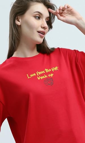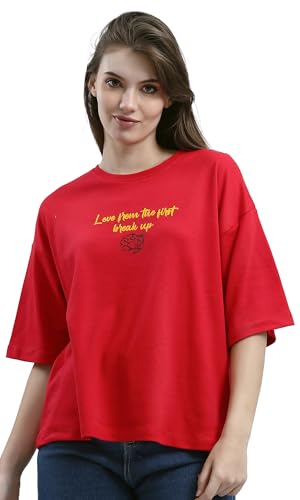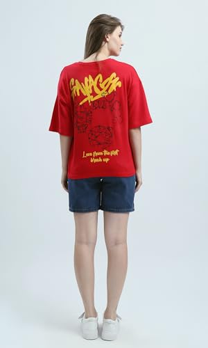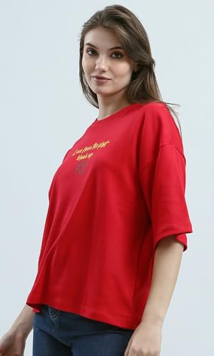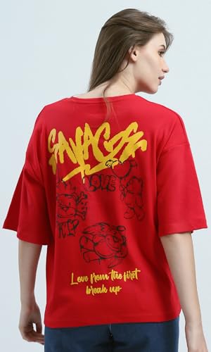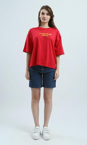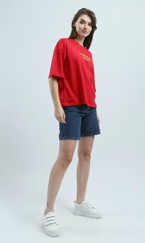 Ravin - ريفين تيشرت قطن باكمام كوع وطبعة امامية وخلفية للنساء - احمر عصري