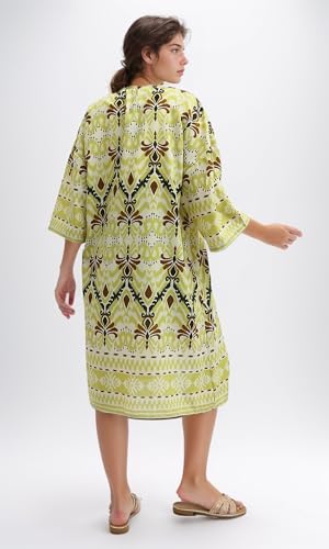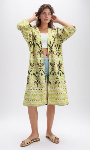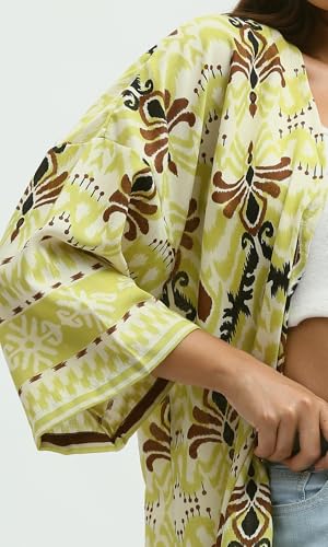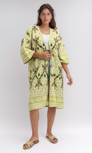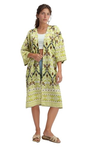 Ravin - كارديجان قطن كيمونو سهل الارتداء من ريفين، لون أخضر نيون وأبيض للنساء