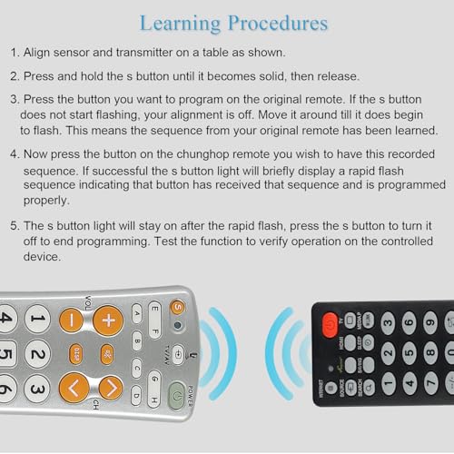 - يمكن لجهاز L108E أن يتعلم فقط من جهاز التحكم عن بعد الأصلي بالأشعة تحت الحمراء الذي يعمل بشكل جيد، يرجى التأكد من أن جهاز التحكم عن بعد الأصلي الخاص بك هو جهاز تحكم عن بعد بالأشعة تحت الحمراء ويعمل بشكل جيد قبل الطلب.