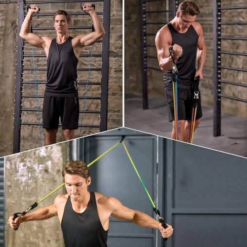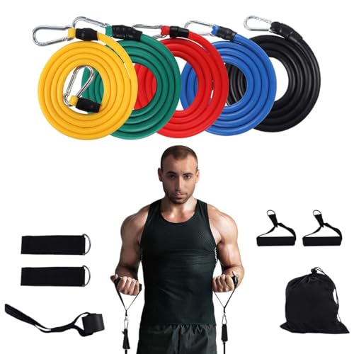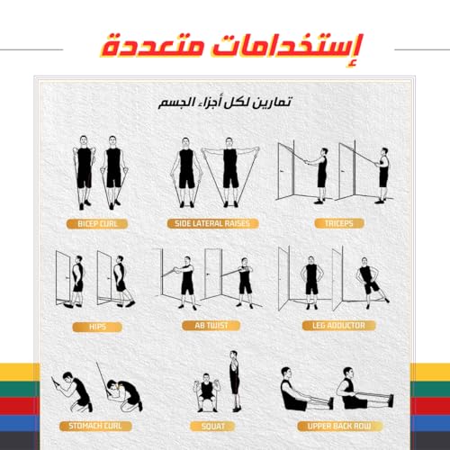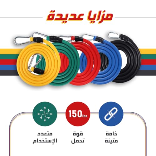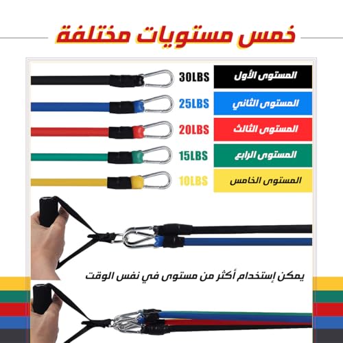 - مجموعة أربطة مقاومة متعددة الاستخدامات: تتضمن 5 أربطة مقاومة مرمزة بالألوان بمستويات مختلفة: الأصفر (4.5 كجم)، والأزرق (9 كجم)، والأحمر (13.6 كجم)، والأخضر (18 كجم)، والأسود (22.6 كجم). مثالي لجميع مستويات اللياقة البدنية وأهداف التمرين.