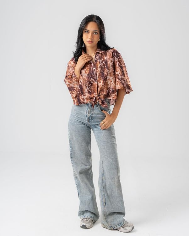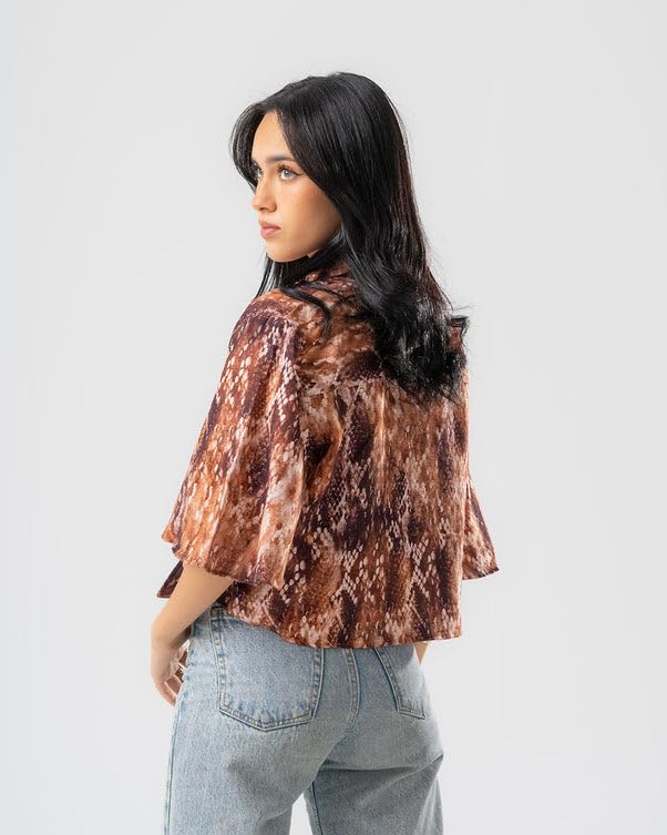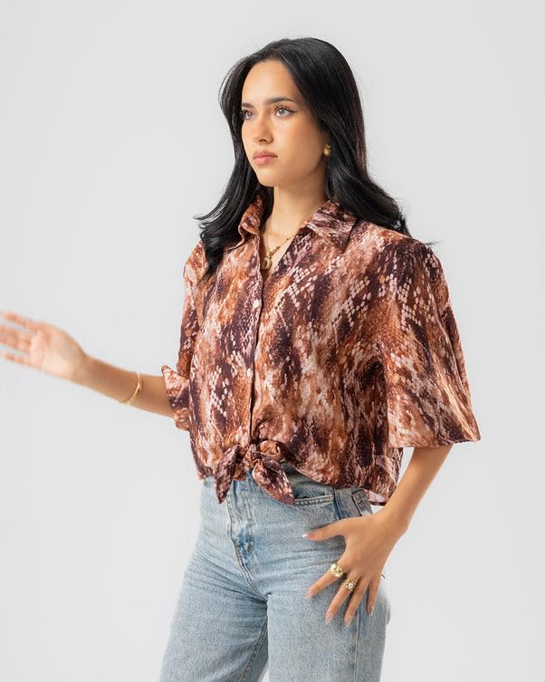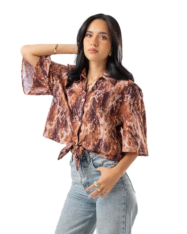 RFA - توب قصير مطبوع للنساء من ار اف ايه، مقاس L، لون بني