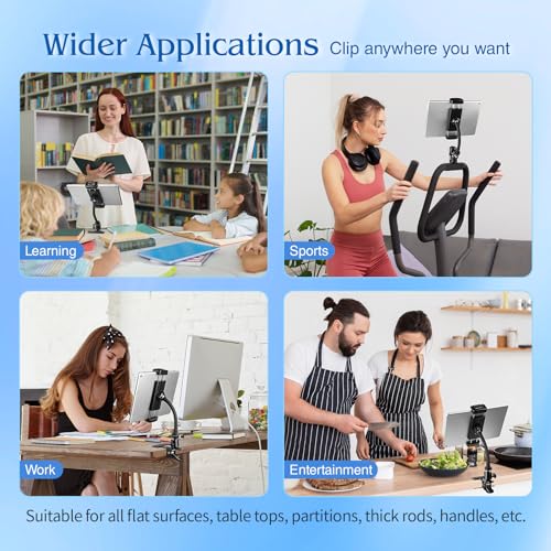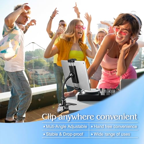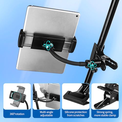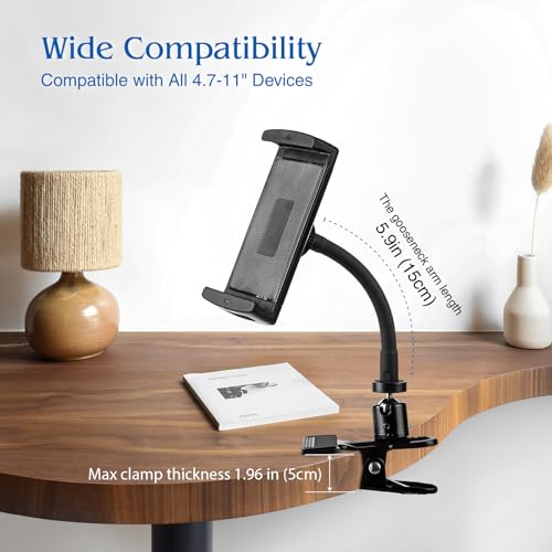 ROCKFREE - حامل تابلت بمشبك للمكتب والطاولة والأسطح المسطحة والأنبوب القوي والعمود وحامل الموسيقى، يأتي مع ذراع مرن بزاوية 360 درجة للموبايلات والتابلت والايباد من 4 إلى 11 بوصة من روك فري