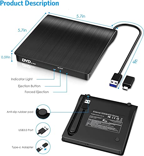 RUOVXWU - مشغل أقراص DVD خارجي محمول، قارئ دي في دي خارجي، مشغل CD خارجي للكمبيوتر المكتبي رفيع للغاية USB 3.0 نوع سي متوافق مع ويندوز 11/10/8.1/7/XP ولينكس من روفكسو