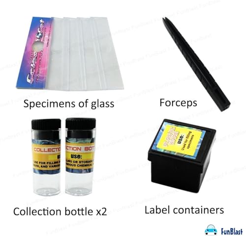 - محتويات العبوة - تتضمن مجموعات المجهر عينات من الزجاج وملصق فارغ وملقط وحاويات بلاستيكية وزجاجتين للتجميع