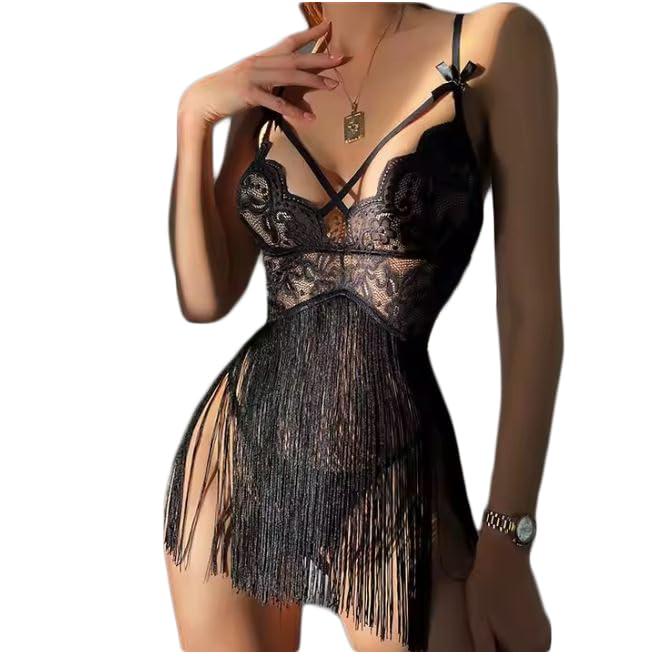 Generic - ملابس داخلية مثيرة، دانتيل شفاف، ديب في، تنورة بشراشيب مغرية، طقم ثوب نوم مثير بدون ظهر