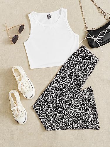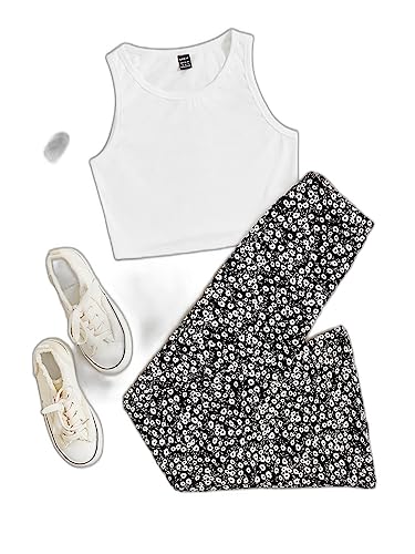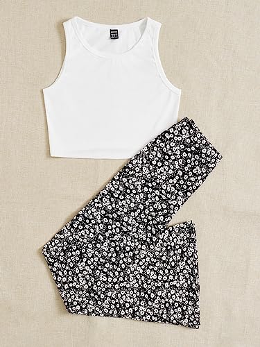 SHEIN - طقم ملابس للنساء مكون من قطعتين مكون من توب كات سادة وسروال مطبوع عليه زهور ديتسي، M1755985، اسود وابيض، XS
