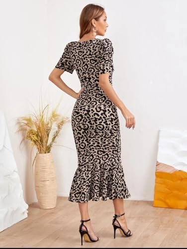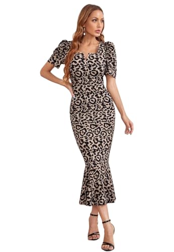 Generic - فستان متوسط الطول بطبعة جلد الفهد واكمام منفوخة ورقبة على شكل حرف V للنساء من شي ان، نمط ضيق ضيق، نمط بيج واسود
