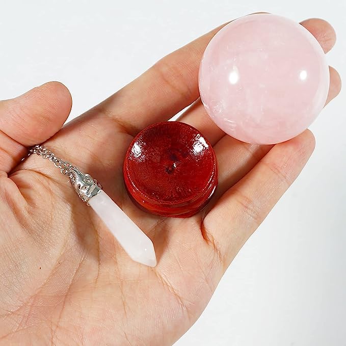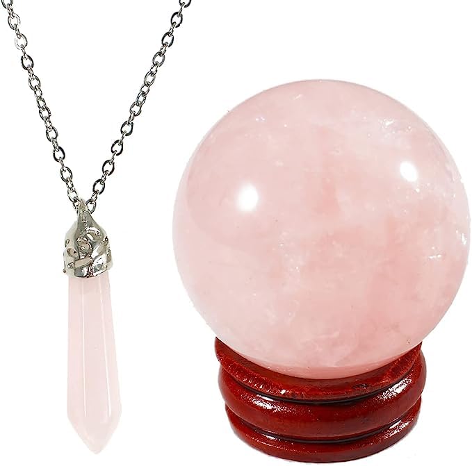 Generic - مجموعة احجار كريمة علاجية من كريستال الكوارتز الوردي الطبيعي من شريف - قطعة واحدة من قلادة منشور سداسية الشكل من الكريستال الزهري وقطعة واحدة من حلية كرة كريستال لليوجا والريكي والتامل