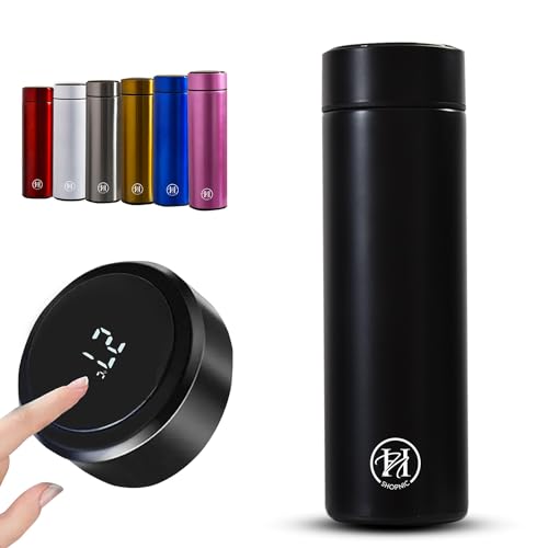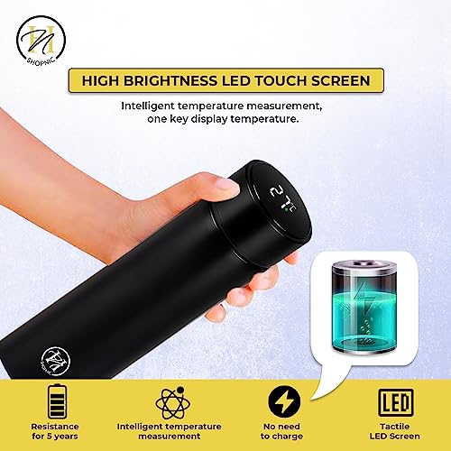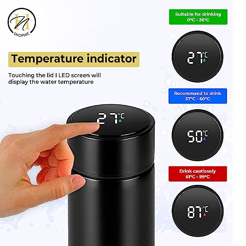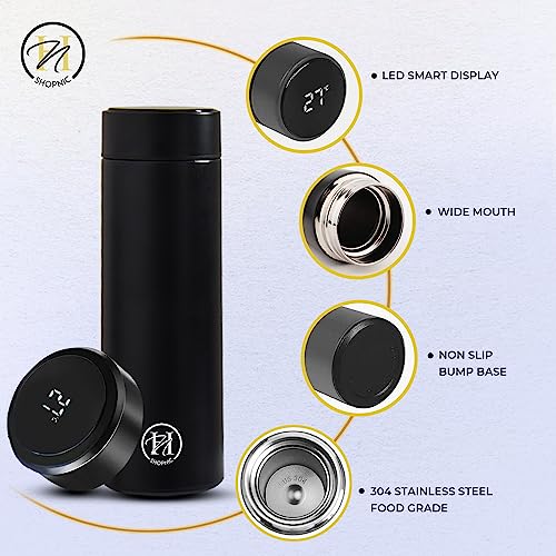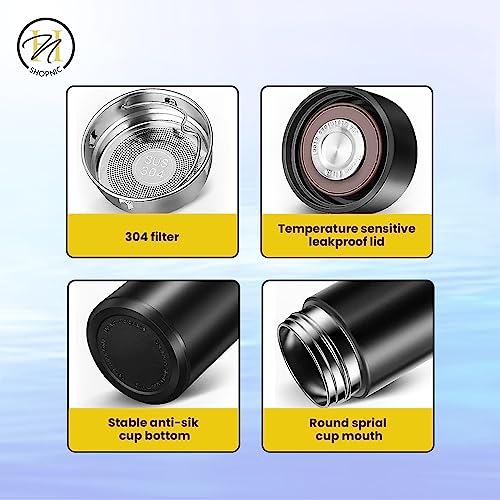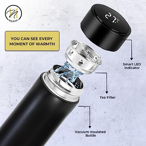 Shopnic - زجاجة مياه ذكية مع شاشة ليد لعرض درجة الحرارة - ترمس معزول بتفريغ الهواء مع مصفاة شاي- زجاجة ذكية تعمل باللمس من الفولاذ المقاوم للصدأ للحفاظ على المشروبات ساخنة أو باردة أثناء السفر من شوبنيك (أسود)