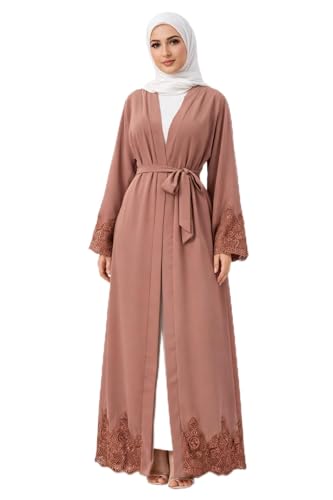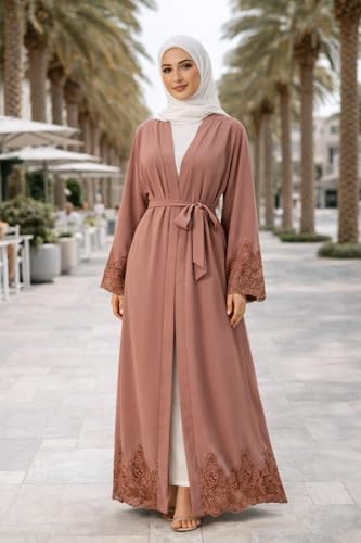 SHOWDAY - كارديجان إسلامي دبي قفطان مطرز بالزهور من الكتان للنساء من شو داي، عباية مطرزة مفتوحة من الأمام، رداء ماكسي إسلامي طويل بنمط دبي، رداء كاردي عربي
