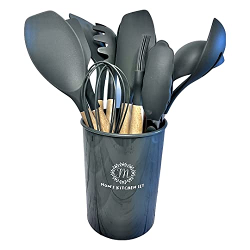 China - مجموعة ادوات مطبخ من السيليكون من 12 قطعة بمقبض من الخيزران مقاومة للحرارة وغير لاصقة مع معلقة عادية ومعلقة سباتولا ومعلقة خفق مع وعاء تخزين (رمادي، 12)