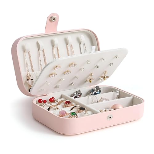 Spaceshoop - منظم مجوهرات صغير من الجلد للسفر، حامل ثلاثي الطبقات مع خطافات للنساء والفتيات، صندوق تخزين محمول للأقراط والخواتم والأساور (وردى)، أكريليك