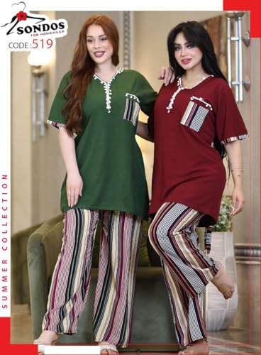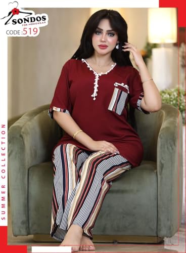SONDOS FOR HOMEWEAR - طقم ملابس نوم للنساء من القطن والفسكوز من بنطلون مخطط مع بلوزة تونيك سادة، مقاس كبير 60-90 كجم من سندس