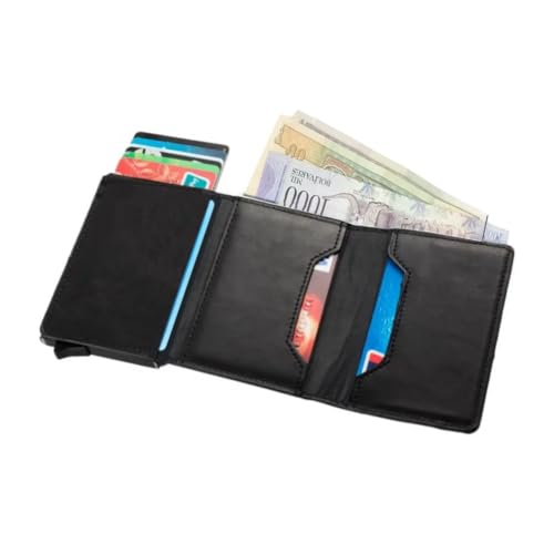 Generic - محفظة بطاقات بتصميم رائع خاص بتقنية تحديد الهوية بموجات الراديو بنمط ثلاثي الطيات من الجلد صغيرة رفيعة بمزيج الألومنيوم حامل الائتمان رجالي وحريمي - اسود