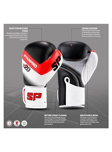 - راحة فائقة: جميع قفازات الملاكمة T20 من ستاربرو مصنوعة من البولي يوريثان المعتمد ومبطنة ببطانة من البوليستر المقاوم للعرق لتوفير الراحة والمتانة ضد التلف الناتج عن الاستعمال. تأتي قفازات الملاكمة T20 بخيارات متعددة الألوان