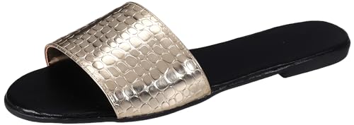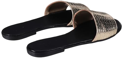 SWAY - حذاء فلات بنعل خارجي مريح أسود مع جزء علوي بحزام متقاطع بسيط ميتالك بنمط جلد التمساح من سواي، لون ذهبي، مقاس 41