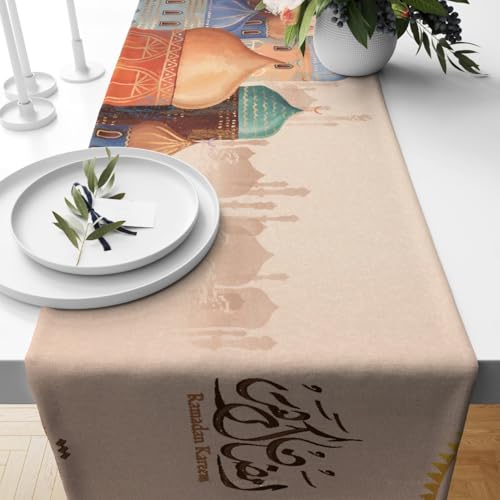 Generic - مفرش طاولة رمضان بتصميم مسجد مقاس 140 سم × 40 سم على خلفية ملونة بطباعة رقمية، مفرش سفره رانر تاربيزه ديكور للمنزل مفرض رمضان رانر