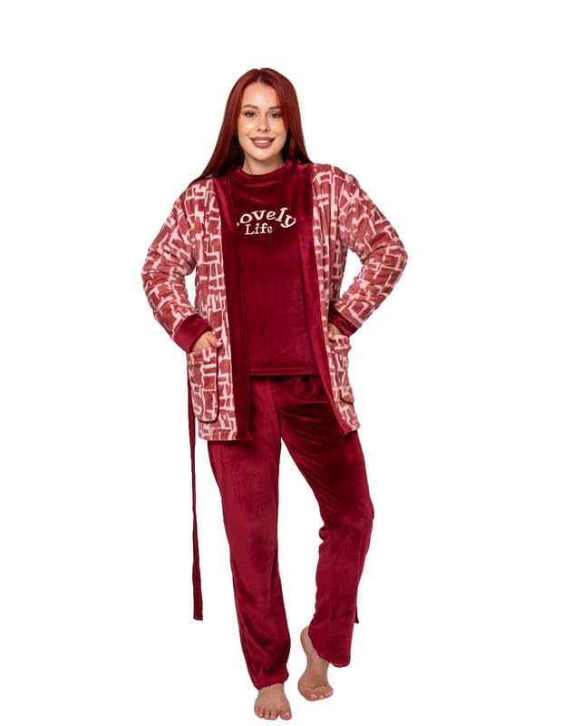 TN - بيجامة قطيفة عصرية للنساء، مكونة من روب وتوب بأكمام طويلة وبنطلون مقاس ميديوم M، لون أحمر، بيجامة شتوية من تي ان، 3 قطع