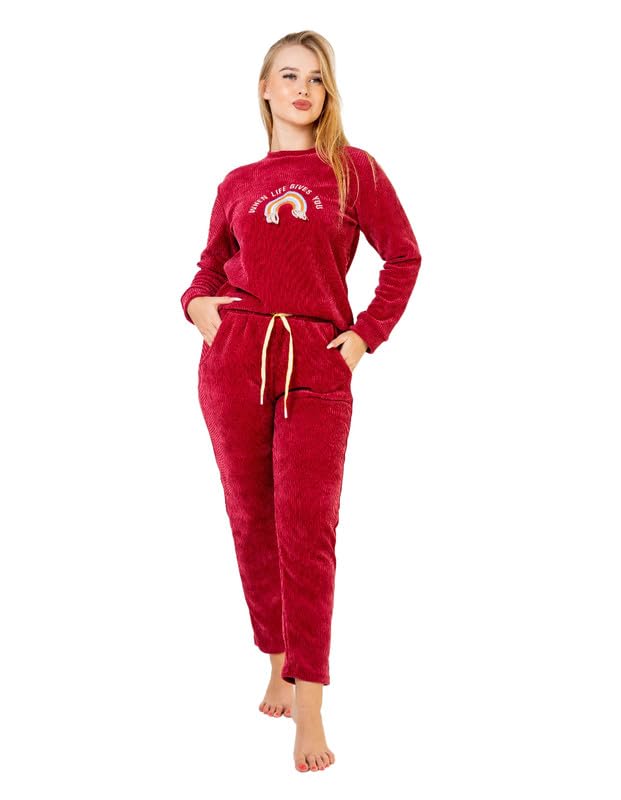 TN - بيجامة قطيفة من بلوزة مطبوعة بأكمام طويلة وبنطلون برباط سحب مناسبة لفصل الشتاء للنساء من تي ان فاشون، لون أحمر، مقاس ميديوم M
