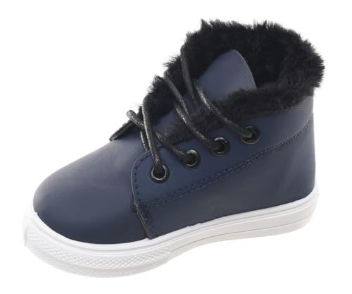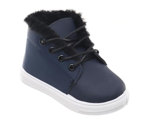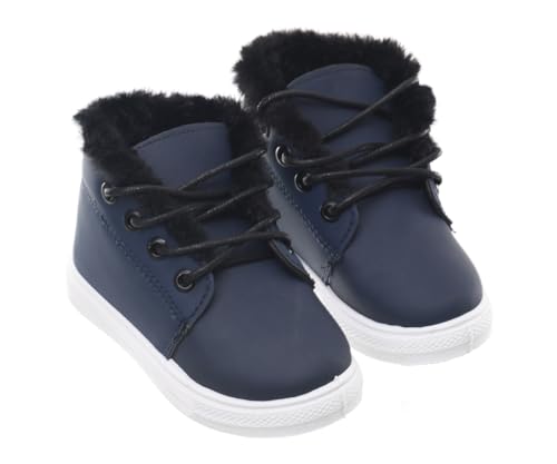 99.99 - بوت شتوي للأطفال الصغار مع بطانة من الفرو الصناعي، حذاء رياضي شمواه برقبة عالية، أربطة سوداء ونعل أبيض، لون أزرق كحلي (23)