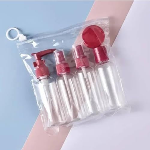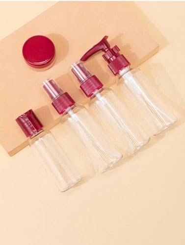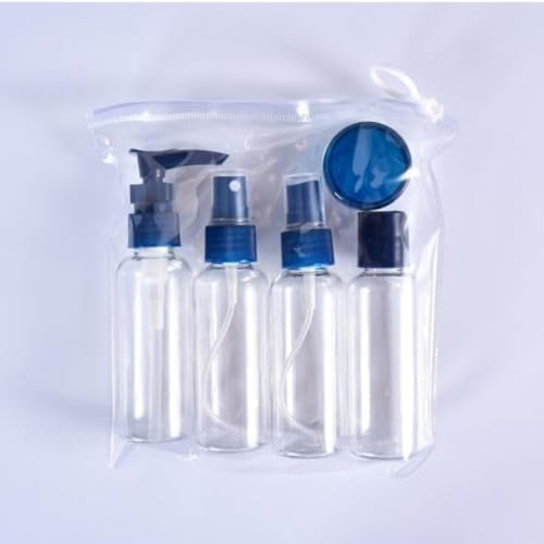 - مجموعة السفر: مجموعة زجاجات أدوات الزينة الكاملة بما في ذلك زجاجات الرش وحاويات بغطاء قلاب وبرطمانات كريم في حقيبة حمل شفافة
