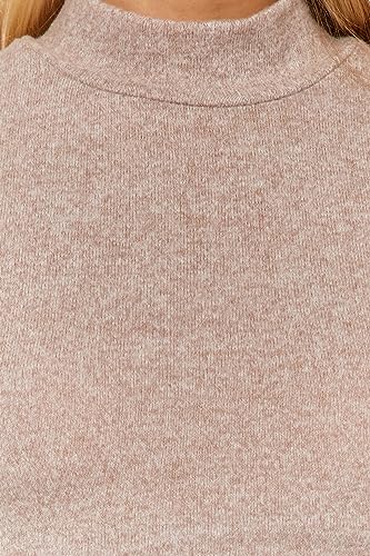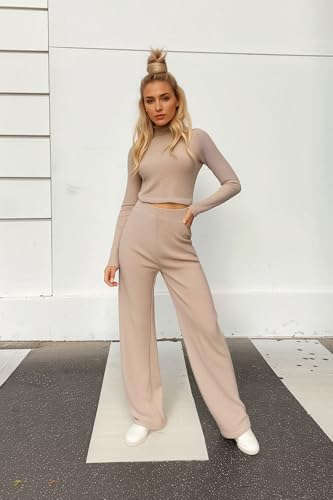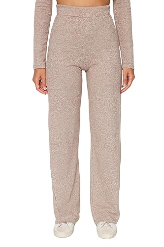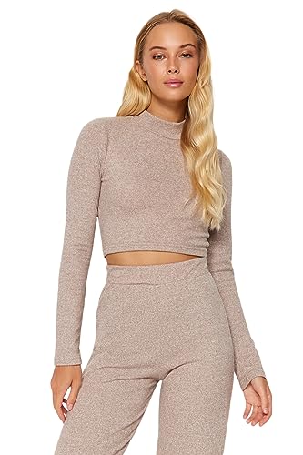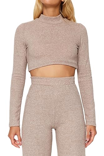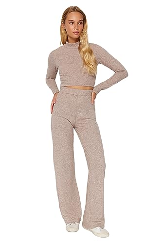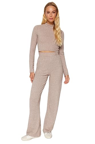 Trendyol - طقم تريكو علوي وسفلي TWOAW24AU00077 للنساء باللون البيج بياقة واقفة وقصة قصيرة ناعمة مع بنطلون واسع الساق من ترينديول