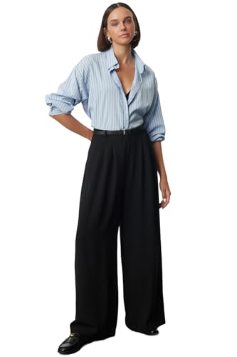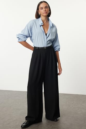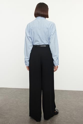 Trendyol - بنطلون منسوج بساق واسعة وبكسرات وحزام للنساء بلون أسود TWOAW25PL00032 من ترينديول