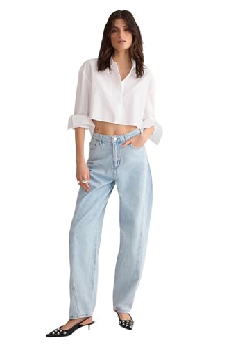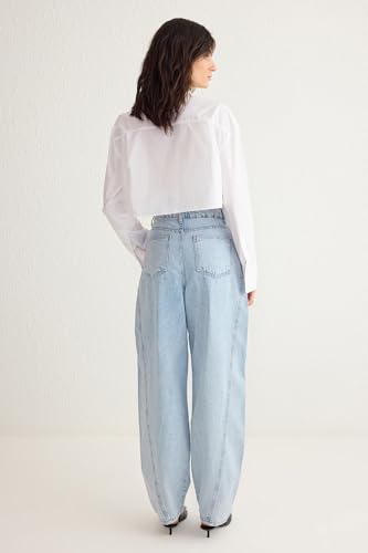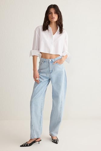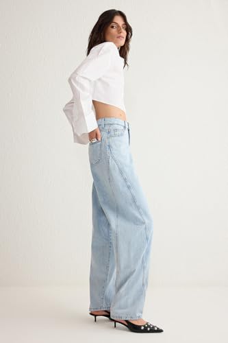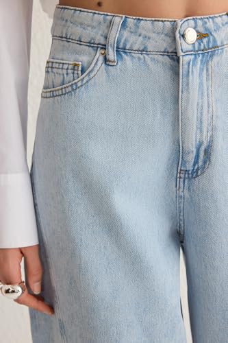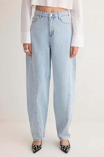 Trendyol - بنطلون جينز فضفاض TWOSS25JE00019 بخصر مرتفع مزين بخياطة للنساء من ترنديول، أزرق فاتح